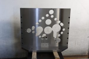 本製品は産業機械の中でプレス機械の内部に組み込まれる部品(部品名:スライド)です。材質はSKD61、サイズは縦490[mm]×横480[mm]×高さ350[mm]、φ400[mm]+0.01~+0.036となっております […]