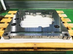 本製品は自動車業界向けに製造した、エンジンブロックを乗せるためのパレットとなります。 本製品は非常に厳しい精度が求められ、比較的大物品(750×750)である上で基準穴からの穴ピッチ間±0.01以内での加工をジグボーラー […]